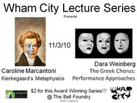 “Caroline Marcantoni speaks on Metaphysics, and Dara Weinberg speaks on the Greek Chorus. Both experts in subjects that need experting in. The information you receive this night will leave your head heavy. You will see everything that happens to you in a completely differnet way. Groups of old men will give you warnings, but you won’t hear them. Everything will be questioned, and the answers may change you.”